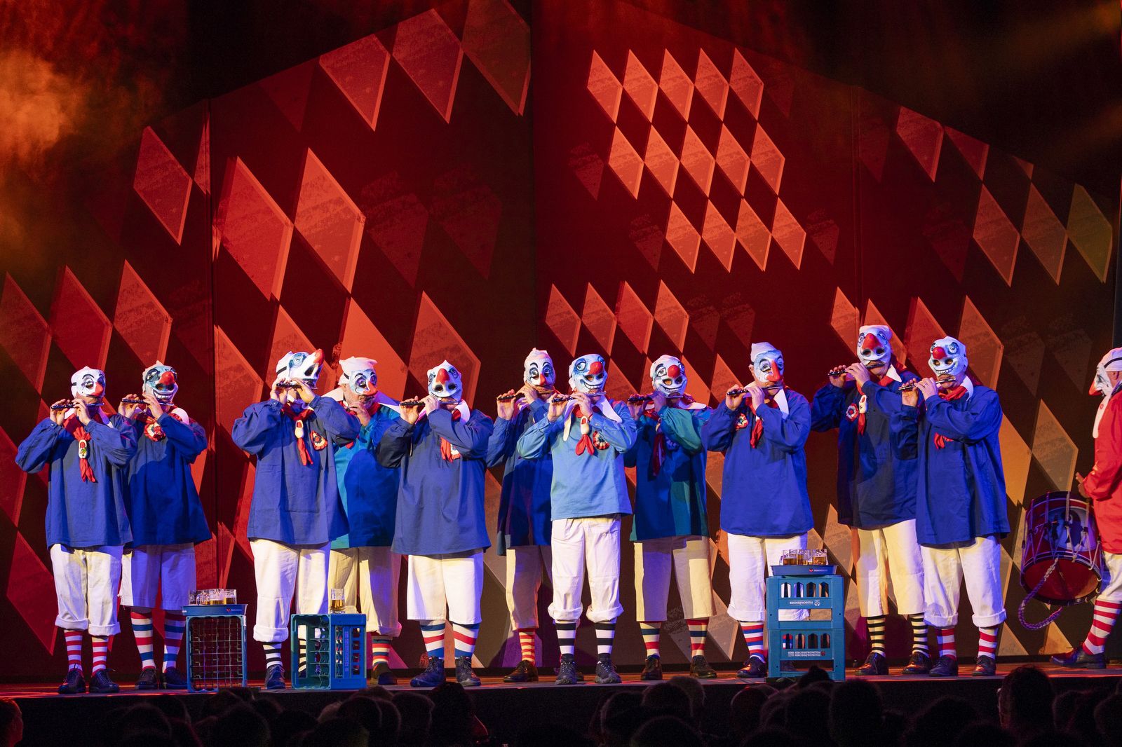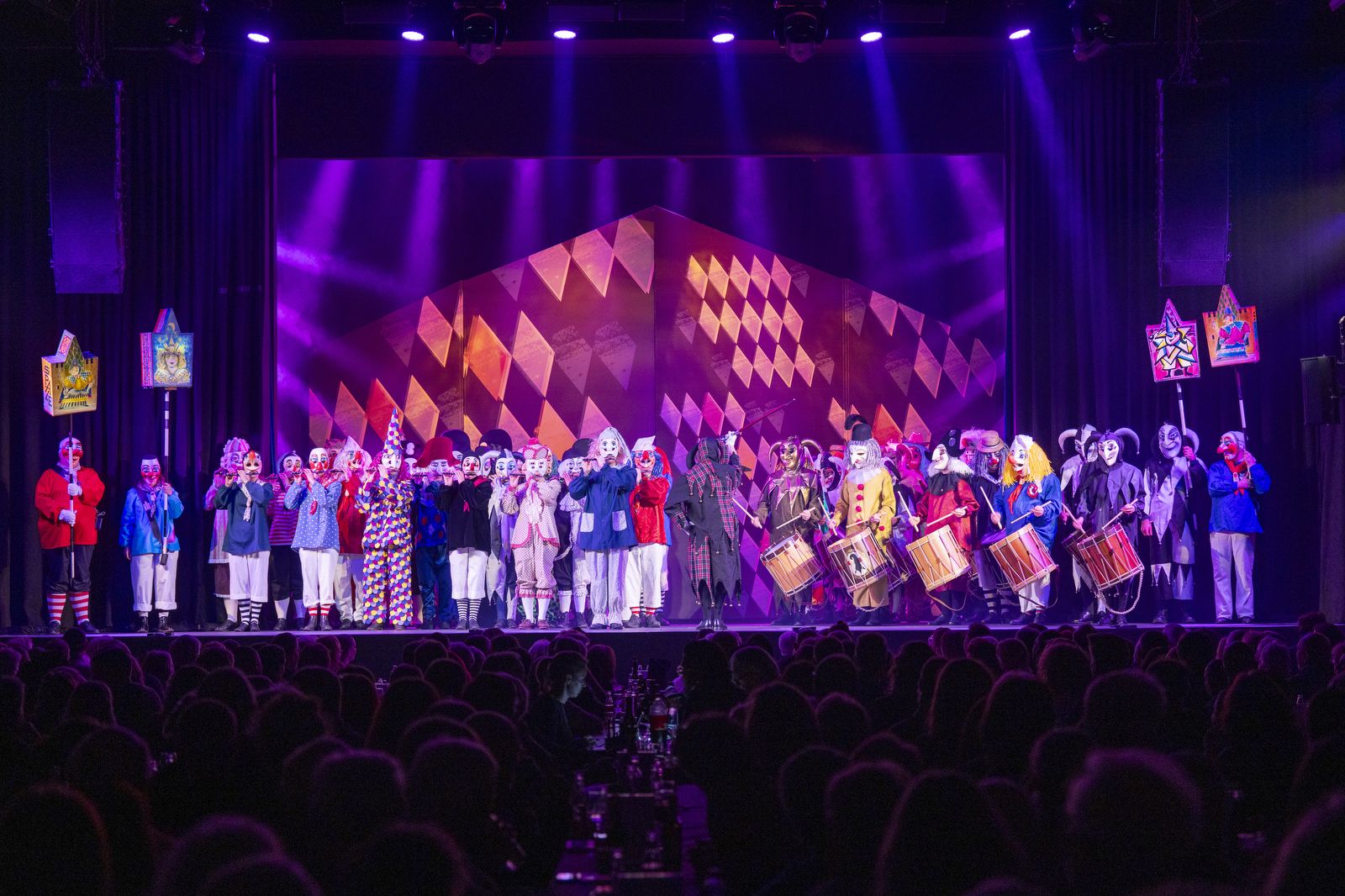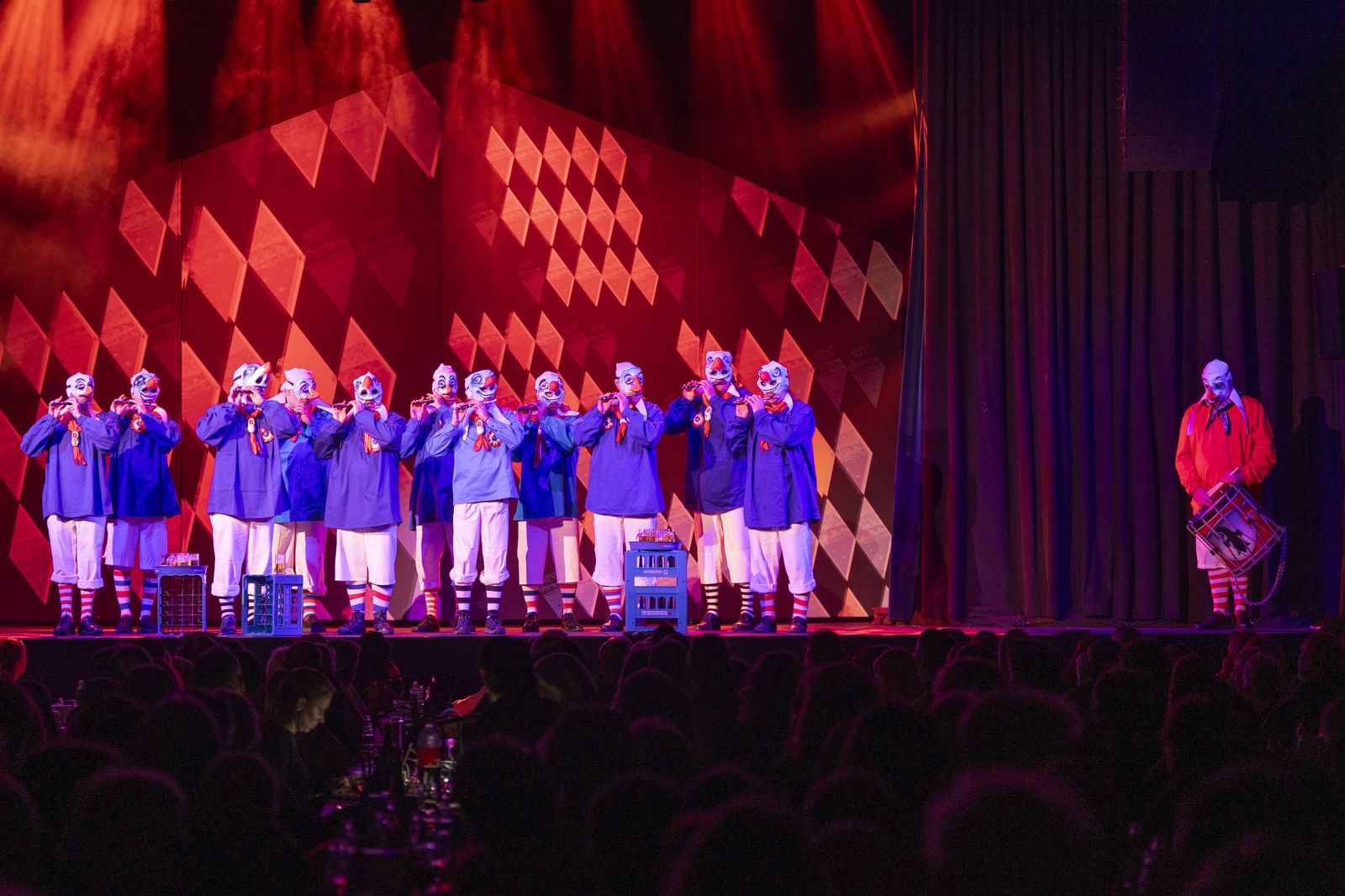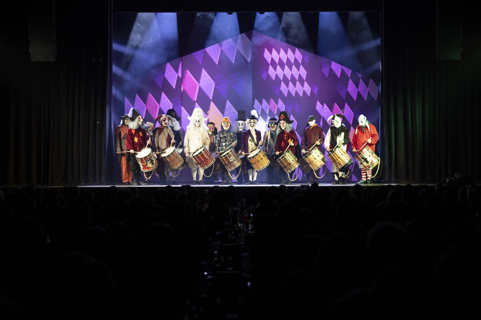 Die Pfeifergruppe Schäärede, vor 20 Jahren eigens für das Charivari ins Leben gerufen, überzeugte einmal mehr durch hochstehende Piccolokunst. Nach einem prächtigen «Verhäxt» im ersten Teil zogen sie das Publikum nach der Pause mit ihrem Jubiläumsmedley «Schääriläum» in ihren Bann – ein wahrer musikalischer Genuss! Eine präzise «Retraite à discrétion» präsentierte die zweite Pfeifergruppe, d Spitzbuebe, begleitet vom Ausnahmetambour Ivan Kym. Für wunderbare klassische Fasnachtsklänge, unter anderem mit dem «Hanswurscht», war die Spale-Clique verantwortlich. Sämtliche Register zog auch der Schnitzelbank Gwäägi und beeindruckte mit überraschenden Verswendungen. Insbesondere ihre Verse zu den BVB und den Polizeiskandalen erhielten von den Zuschauern grossen Beifall. Treffsicher zeigte sich auch der zweite Bank, s Dintelimpli, und punktete unter anderem mit seinen politischen Pointen. Die Guggenmusiken Uelischränzer Basel 1979 und die 75-jährige Schränz-Gritte brachten mit ihrem kraftvollen Sound das Volkshaus zum Zittern. Stimmig abgerundet wurde das fasnächtliche Programm durch die gemeinsamen Tambourensoli der Rotstab-Clique Liestal 1930 und der Fasnachtzunft Ryburg. Zwischen den Programmpunkten sorgten die aussergewöhnlichen Musiker Patrick Stalder an der Klarinette und Marwin Näpflin am Schwyzerörgeli sowie der Basler Spitzentambour Maurice Weiss mit packenden «Jam-Sessions» für lebhafte und energiegeladene Intermezzi – ein musikalischer Höhenflug. Nach jedem Programmteil wurden Punkte vergeben, ganz im Stil des ESC – ein witzig inszeniertes, durchgehendes Element.